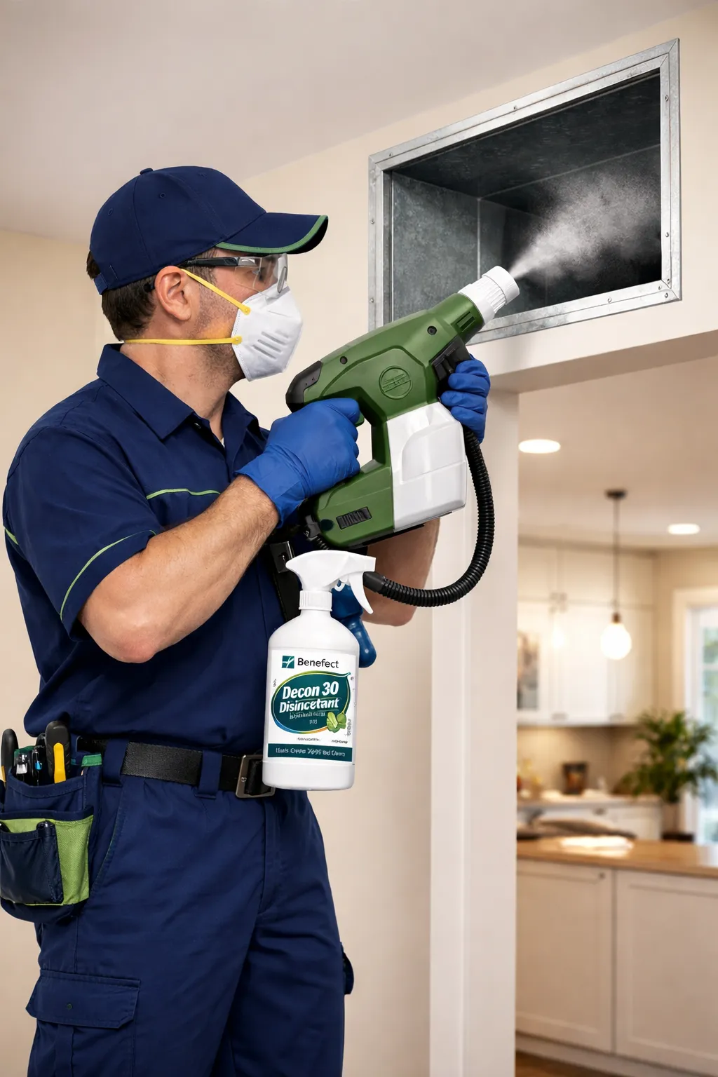 As part of our comprehensive air duct cleaning service, we offer a professional disinfecting treatment using Benefect® Disinfecting Solution. This step is designed to help reduce bacteria, mold, and odor-causing contaminants inside your HVAC system.