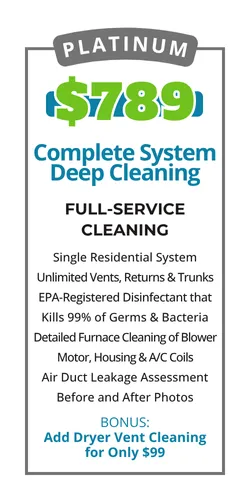 • Platinum ($789) – A full-service deep cleaning of a single residential system that includes disinfecting, a detailed furnace cleaning of the blower motor, housing, and A/C coils, as well as an air duct leakage assessment.